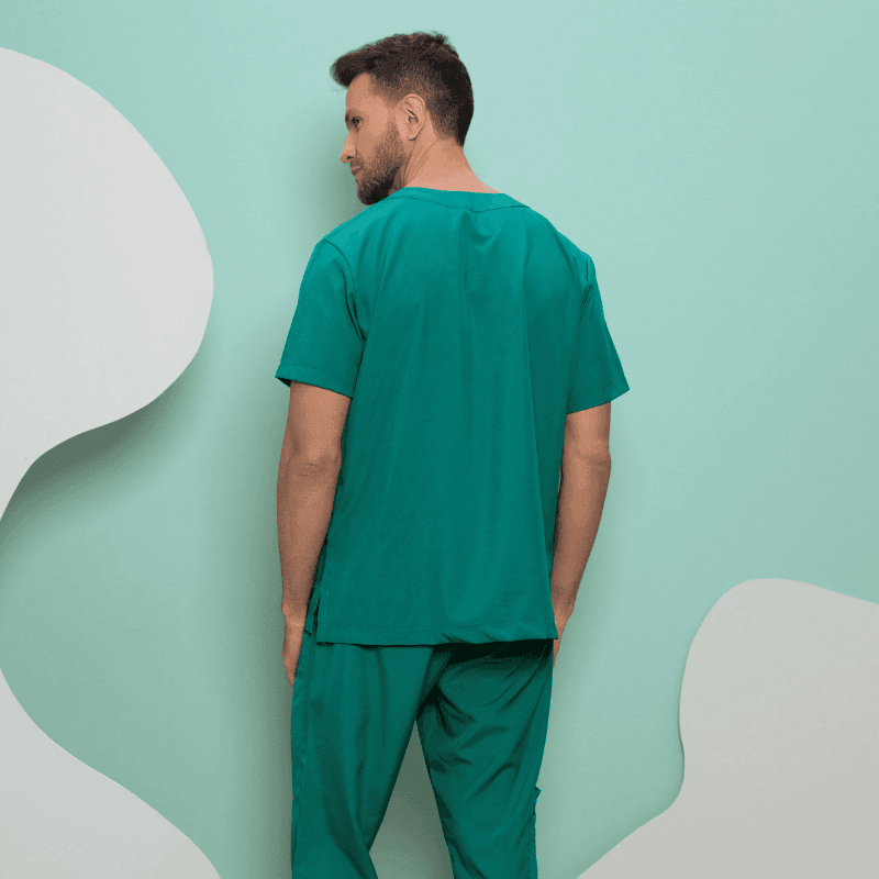 Modelo masculino com corte clássico, ideal para profissionais que buscam um uniforme funcional e confortável.